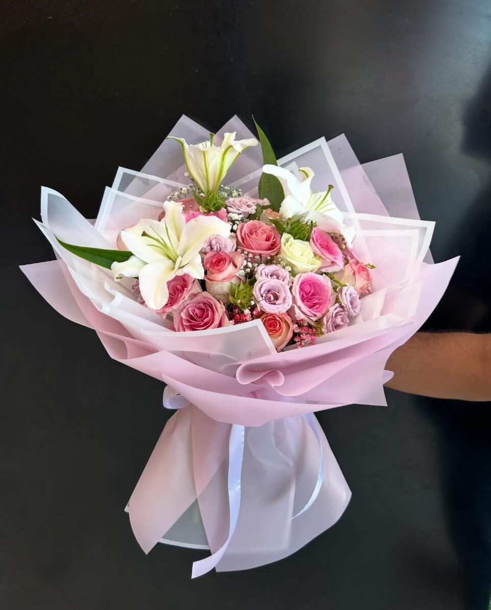 💐 Bouquet de Lys et Roses Roses – Offrez une touche d’élégance pure.